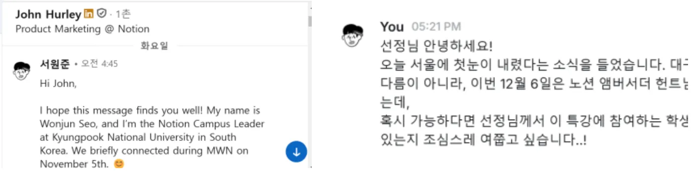 나는 노션 캠퍼스리더 커뮤니티 사업 담당이신 노션 코리아의 변선정 퍼실리테이터님과 노션 샌프란시스코 본사의 Product Marketing 팀장이신 John 각각에게 경북대학교 학생들을 대상으로 영상편지를 요청드렸다.