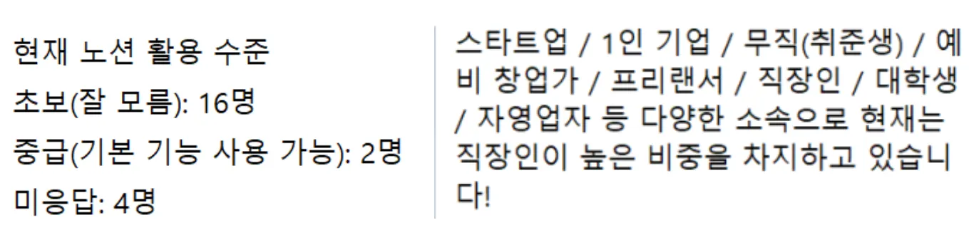 직장 내 업무를 효율적으로 할 수 있는 툴에 대해 고민하던 중에 노션 강의를 접하게 되어 참여하게 되었다고 하셨다.