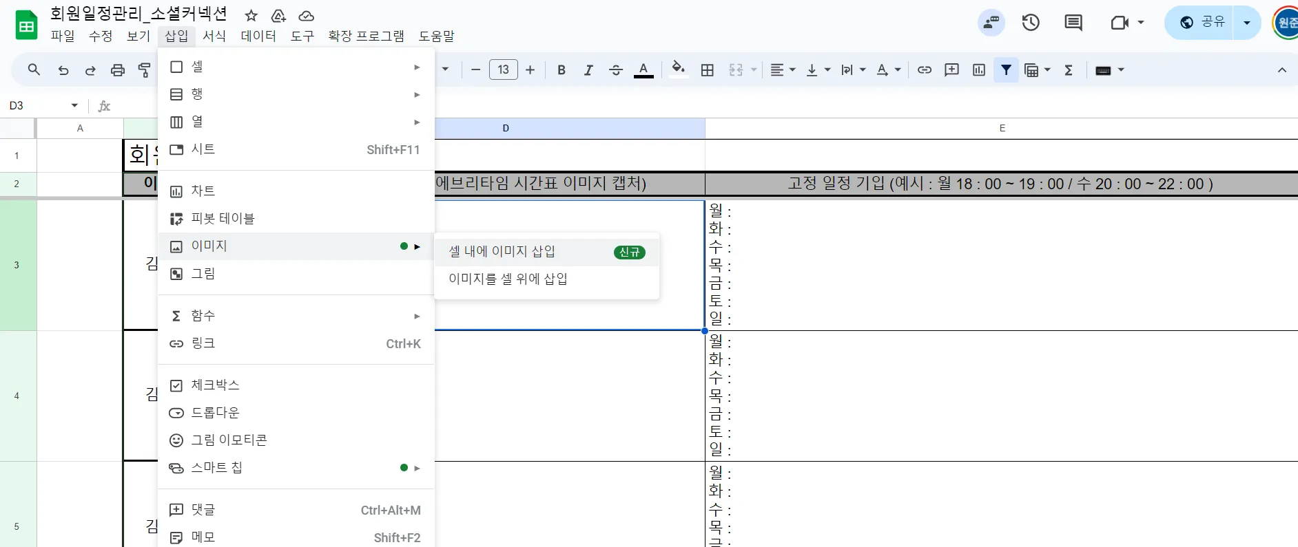 스프레드시트에 사진 첨부하는 방법