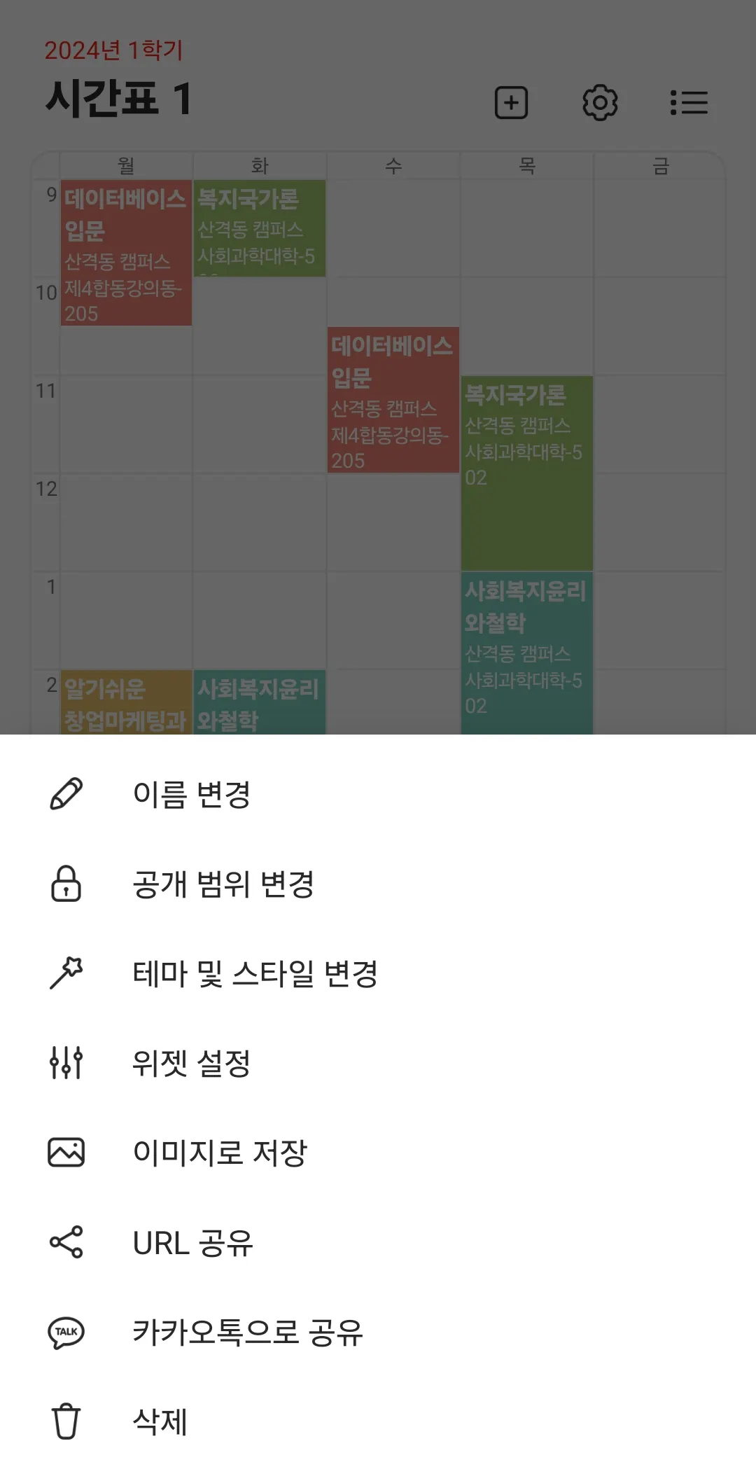 시간표는 ‘에브리타임’ 앱 → ‘시간표’ 메뉴 클릭 → ‘설정’ 버튼 클릭 후 ‘이미지로 저장’을 눌러주세요.