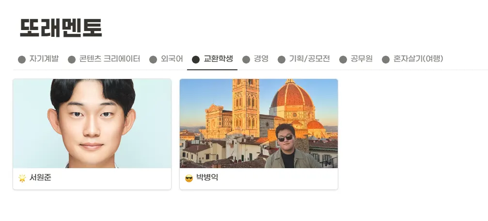 예) •자기계발 클릭 시, 자기계발 카테고리에 해당되는 또래멘토들을 만나볼 수 있습니다.
