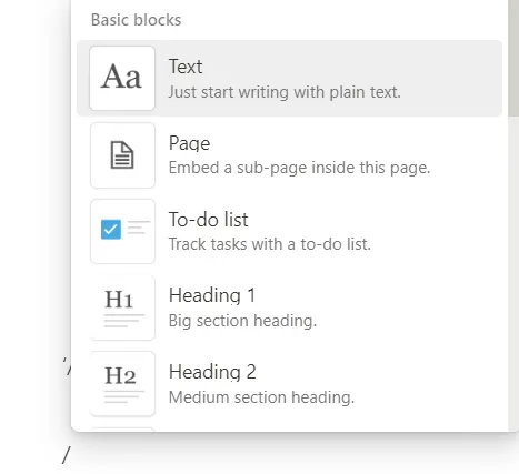 ‘/’ 입력 혹은 ‘+’ 클릭 시, 원하는 옵션을 선택하실 수 있습니다.