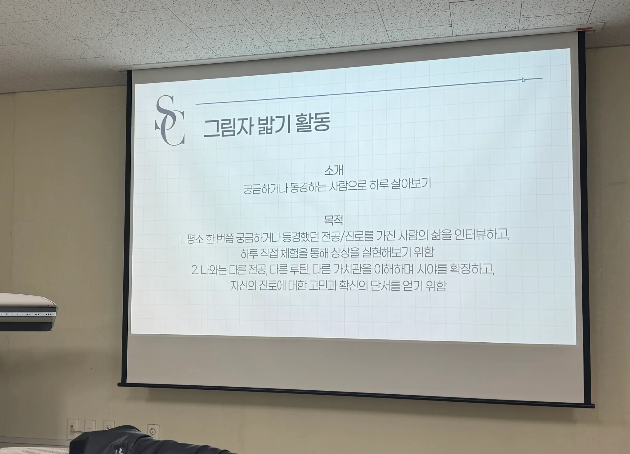 3차시 활동은 예강선배님이 진행하는 그림자밟기 활동인데요, 간단하게 설명하자면 그림자밟기 활동은 궁금하거나 동경하는 사람으로 하루를 살아보는 활동입니다